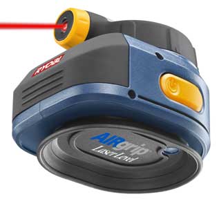 The AIRgrip laser level uses a small battery-powered motor to create a vacuum on the bottom of a rubber base so that it can stick to painted walls, untreated drywall, most wall paper and many other non-porous surfaces. Unlike devices which use pins, nails or expensive adhesive tapes, the AIRgrip laser level will not leave a single mark on a wall, yet is powerful enough to adhere both vertically or horizontally for several hours at a time.