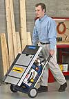 RYOBI now has the BTS20a lightweight  contractor's saw that, when stood on end, takes up only a couple square feet of valuable floorspace. This 91-pound, 10" portable table saw features a 27" rip capacity and folding leg stand with wheels. This saw has a maximum depth of 3-5/8" at 90 degrees and 2-1/2" at 45 degrees. It's driven by a powerful 15 amp, 115-volt universal direct-drive motor that runs at 4800 RPM. Its dust collection port can be connected to a 2-1/4" vacuum hose to keep the work area clean. This saw is available at Home Depot for under $250