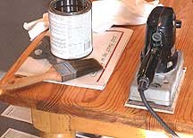 But first I wanted to do a little more sanding with my electric finishing sander, equipped with fine, 220-grit sandpaper. Wearing a dust mask, I sanded in line with the wood grain until the surface was smooth. (Note: This table has an antique look, with little nicks and marks that add to its character; I was careful not to sand too much.)